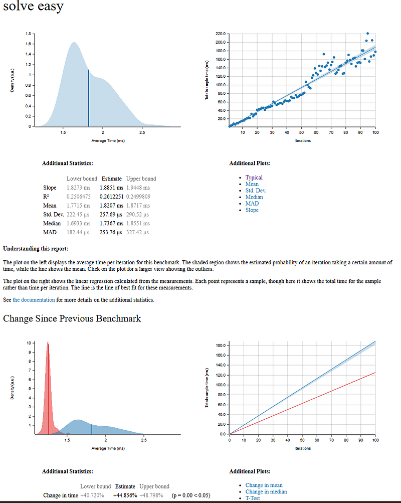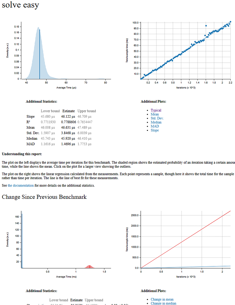 This is a form of constraint propagation, and it dramatically prunes the search space for the backtracking solver. This change brought the time down to an incredible 33 seconds for the easy puzzles (a 74% improvement) and 17.8 seconds for the diabolical puzzles (a 69% improvement). The benchmark now shows that the new improvements to the algorithm is significantly improving the time to solve a single puzzle, changing from 1.2 ms to 46 µs.