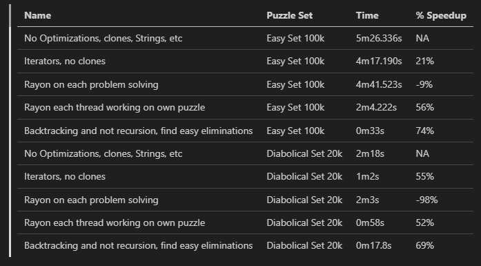 This “embarrassingly parallel” approach was very effective, resulting in a 56% speedup on the easy puzzles and a 52% speedup on the diabolical puzzles. The benchmark iteration is looking much better. Something to note is that the time to solve the puzzle has not changed much since the first solution, but we are using parallelism of the cpu cores better.